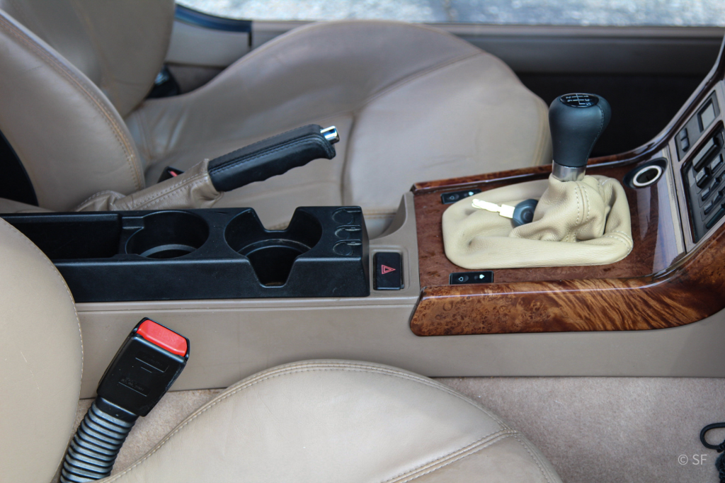 The cabin features two heated bucket seats trimmed in beige leather, and matching leather extends to the door panel inserts. Amenities include a BMW Business CD stereo, cruise control, and air conditioning.